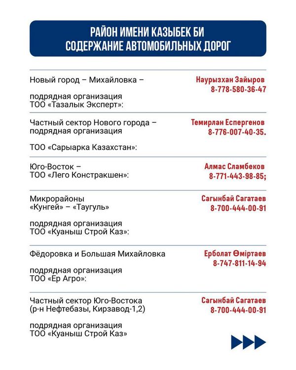 Жители Караганды могут напрямую связаться с подрядными организациями, которые отвечают за содержание дорог, вывоз мусора и благоустройство, передает «24KZ».