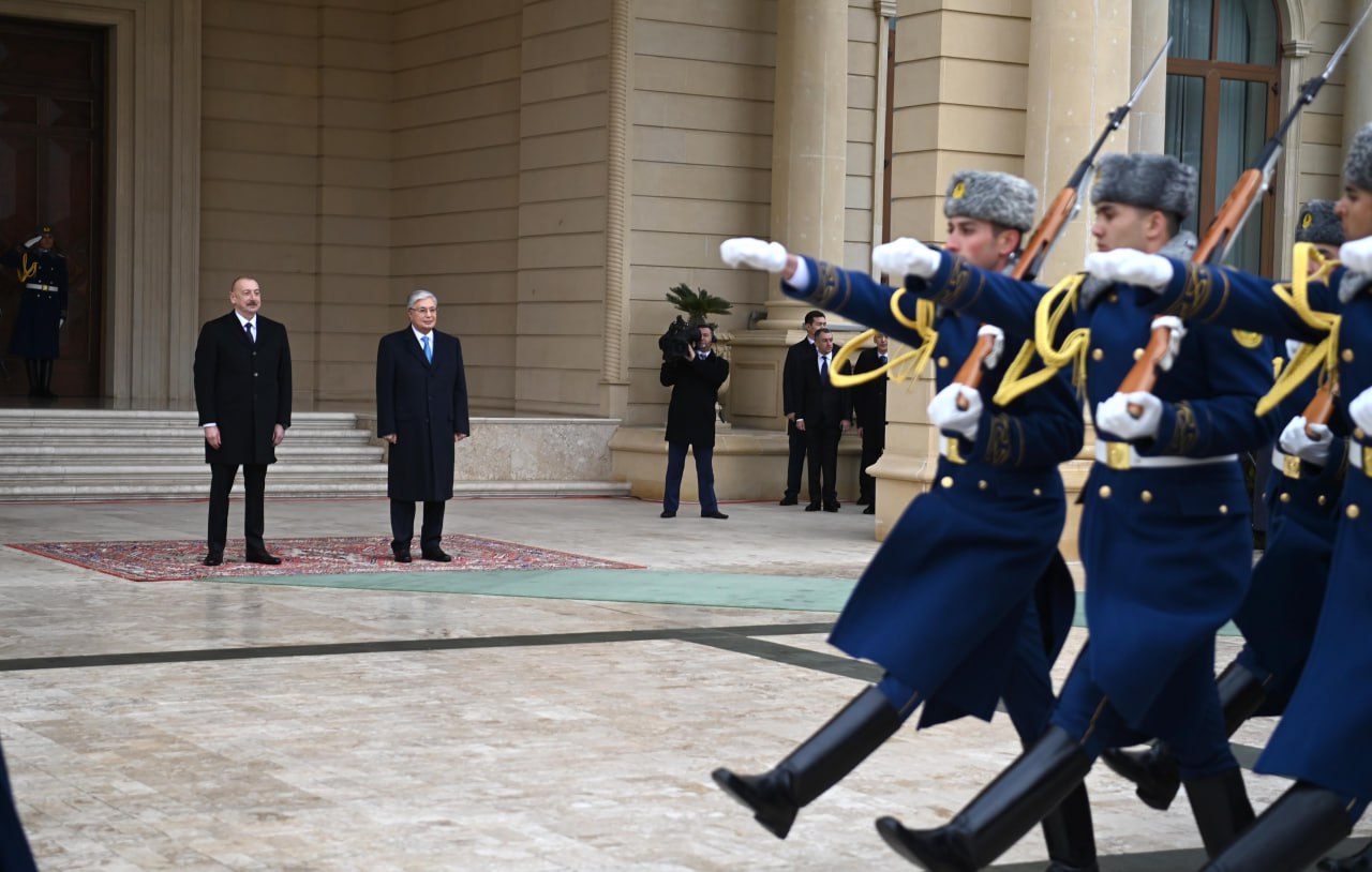 Құрмет қарауылының бастығы екі ел басшыларына рапорт берді. Қазақстан мен Әзербайжанның мемлекеттік әнұрандары шырқалғаннан кейін Қасым-Жомарт Тоқаев пен Ильхам Әлиев бір-біріне ресми делегация мүшелерін таныстырды.