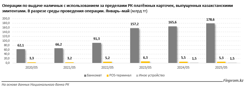 Выдача наличных за пределами страны с использованием казахстанских карт составила 185,4 млрд тг — лишь на 7,4% больше, чем за январь–май 2024 года.