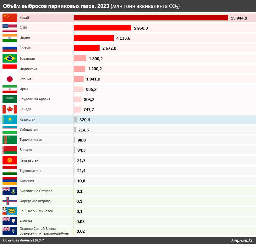 Казахстан среди стран ЦА и ЕАЭС опережает по выбросам парниковых газов лишь Россия. В 2023 году в РК объём выбросов составил 320,4 млн тонн эквивалента CO₂. Значительный показатель также был отмечен в Узбекистане: 214,5 млн тонн. Наименьшие объёмы выбросов пришлись на Армению (10,8 млн тонн), Таджикистан (21,4 млн тонн) и Кыргызстан (21,7 млн тонн).