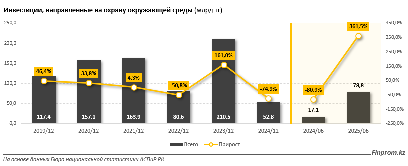 Объём инвестиций, направленных на охрану окружающей среды, в первом полугодии текущего года в Казахстане составил 78,8 млрд тг — сразу в 4,6 раза больше, чем за аналогичный период 2024-го. Для сравнения: годом ранее было отмечено сокращение капиталовложений сразу в 5,2 раза, передает «24KZ» со ссылкой на Finprom.kz.