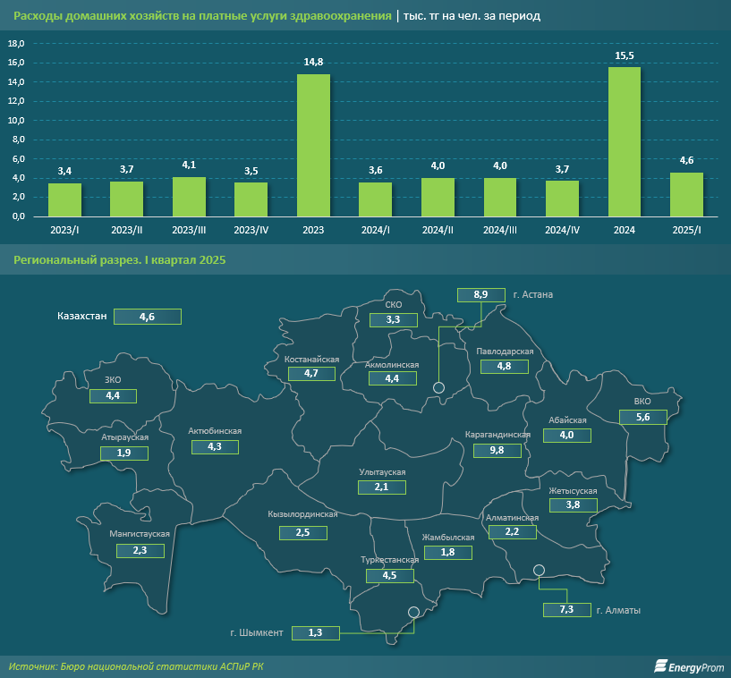 Примечательно, что в разных регионах страны показатели среднедушевых расходов на платные медицинские услуги могут сильно различаться. Например, за первый квартал 2025-го шымкентцы потратили на лечение 1,3 тыс. тг, тогда как в Астане показатель достиг 8,9 тыс. тг. Наибольшие среднедушевые расходы на платную медицину наблюдались в Карагандинской области: 9,8 тыс. тг — в 2 раза больше, чем в среднем по стране.