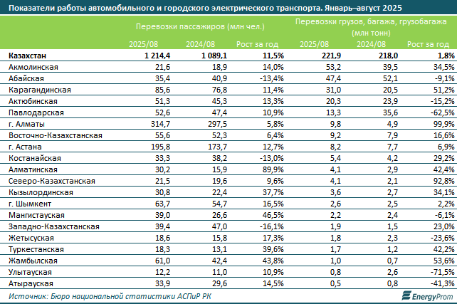 За январь–август текущего года в РК автомобильным и городским электрическим транспортом было перевезено 1,2 млрд пассажиров — на 11,5% больше, чем за аналогичный период 2024-го, передает «24KZ» со ссылкой на Energyprom.kz.