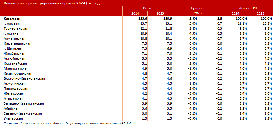 В 2024 году в Казахстане было зарегистрировано 123,6 тыс. браков — на 2,3% больше по сравнению с предыдущим годом. В региональном разрезе лидером стал Алматы, где зарегистрировали 13,7 тыс. браков — на 5% больше, чем годом ранее (13,1 тыс.). На втором месте оказалась Туркестанская область (12,1 тыс. браков), на третьем — Астана (10,9 тыс.). Меньше всего браков было зарегистрировано в Улытауской области: 1,5 тыс. Скромные показатели были также отмечены в Северо-Казахстанской (3 тыс. браков) и Абайской (3,6 тыс.) областях, передает «24KZ» со ссылкой на Ranking.kz.