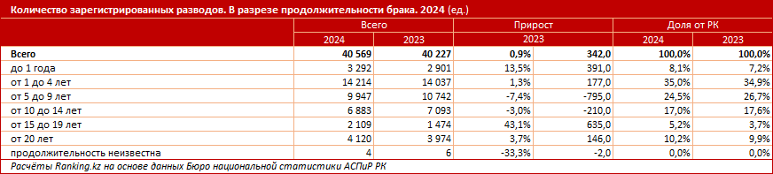 Что касается разводов, в 2024 году в Казахстане было зарегистрировано 40,6 тыс. случаев расторжения брака — на 0,9% больше, чем годом ранее. Чаще всего распадались семьи, просуществовавшие от 1 до 4 лет: количество таких разводов составило 14,2 тыс. — на 1,3% больше, чем в 2023 году. Далее идут случаи расторжения брака продолжительностью в 5–9 лет (9,9 тыс.) и 10–14 лет (6,9 тыс.).