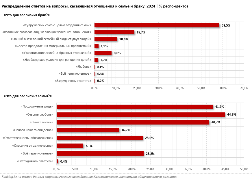 Согласно результатам социологического исследования Казахстанского института общественного развития, граждане РК относятся по-разному к таким понятиям, как «семья» и «брак». Так, семья для большинства респондентов в первую очередь ассоциируется со счастьем и любовью (44,9%), продолжением рода (41,7%) и смыслом жизни (40,7%). Кроме того, 23% опрошенных рассматривают семью как ответственность и обязательства, а 16,7% — как основу общества. При этом лишь 7,1% считают, что семья прежде всего является способом избежать одиночества.