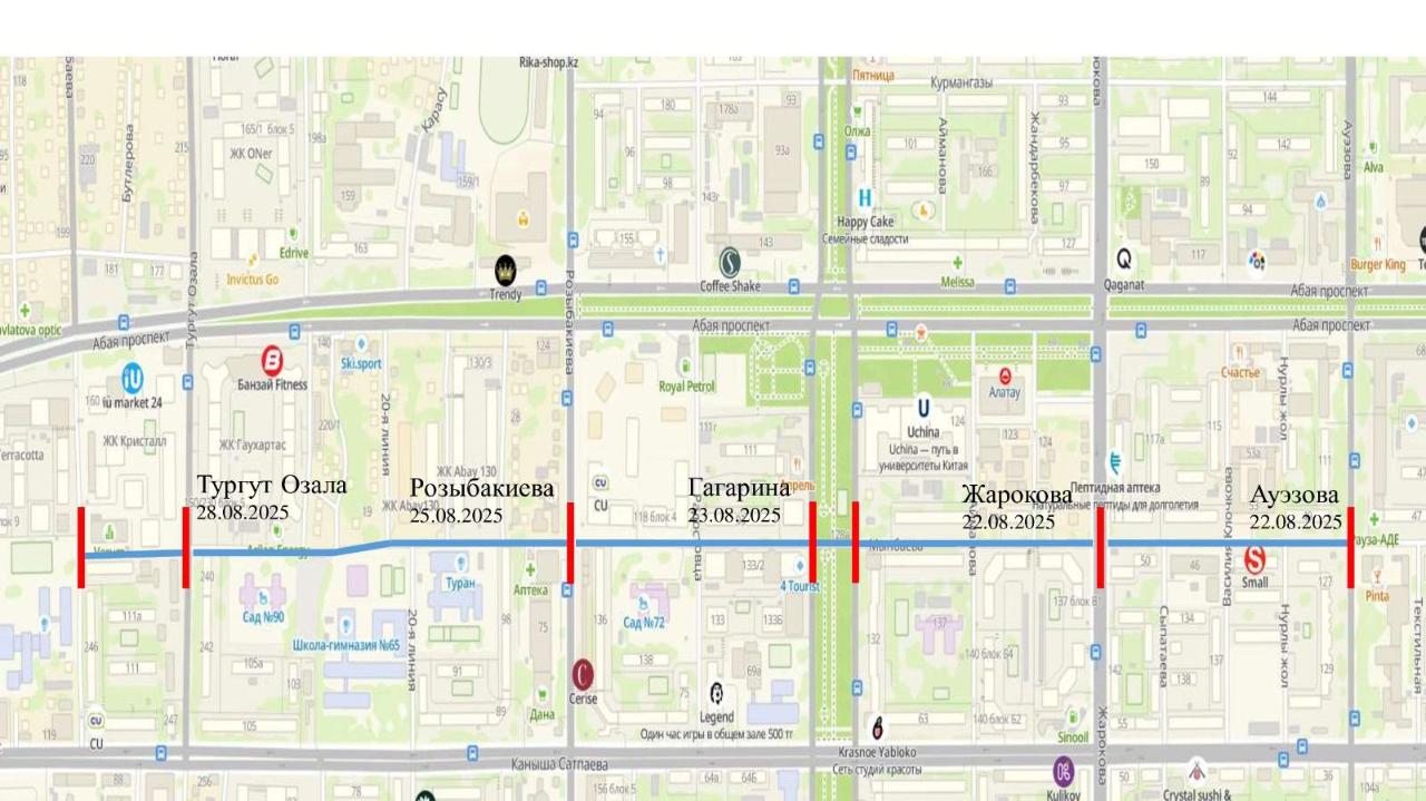 С 25 по 28 августа движение транспорта будет остановлено по ул. Тургут Озала на участке между пр. Абая и ул. Сатпаева