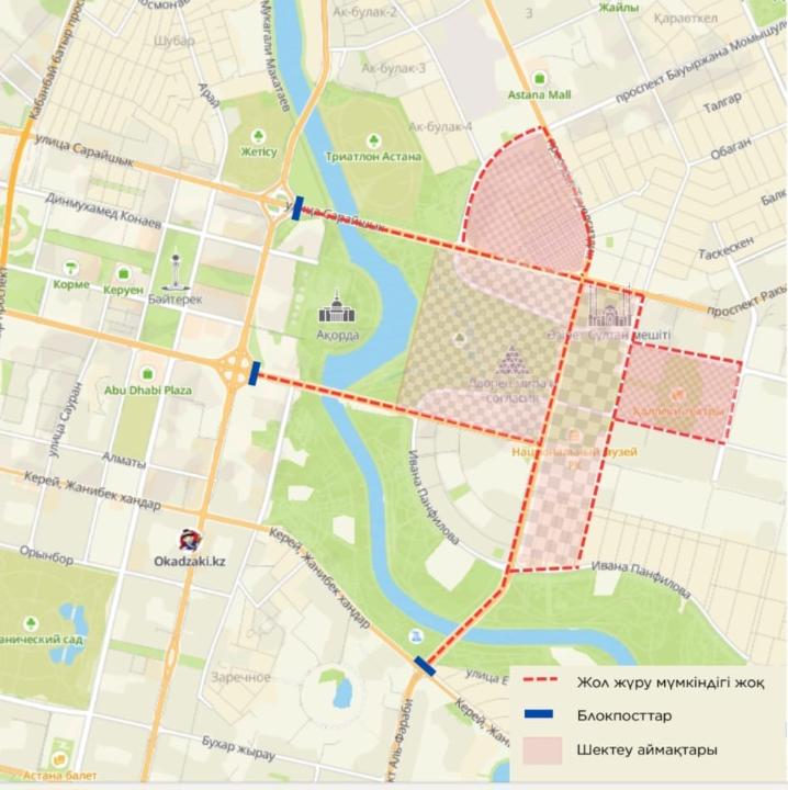 Дополнительно, с 5:00 до 13:00, перекроют проспект Тәуелсіздік (от Момышулы до Панфилова), а также ограничат движение на улицах Акыртас, Калдаякова и Кошкарбаева — там будет временно размещена техника.