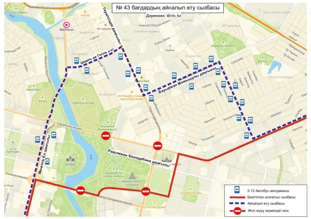 Сразу после этого, с 6:30 до 8:00, по маршруту А-334 — Акжол — Кошкарбаева — Аманжолова — Нажимеденова начнётся подвоз личного состава парадного расчета.