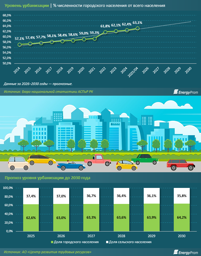 Несколько лет назад эксперты АО «Центр развития трудовых ресурсов» (организации, подведомственной Министерству труда и социальной защиты населения РК), делали демографический прогноз на ближайшие годы. Согласно базовому сценарию, к концу 2025-го уровень урбанизации должен был достичь 62,6%. Реальные данные показывают, что процесс идёт даже быстрее, чем рассчитывали аналитики. Согласно расчётам, к 2030 году в городах будут жить 64,2% населения Казахстана, а к 2050-му — уже 69,4%.