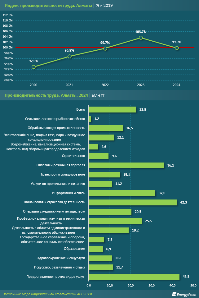 Сервисный характер экономики Южной столицы говорит о том, что производительность труда в Алматы должна быть выше в соответствующих видах экономической деятельности. Это подтверждают и отчёты. В 2024 году наибольший показатель производительности труда в Алматы был отмечен в категории «Предоставление прочих видов услуг» (то есть самых разных услуг, не вошедших в основные макрокатегории): 43,5 млн тг. На втором месте оказалась сфера финансов и страхования: 42,3 млн тг. Высокие показатели также наблюдались в секторе торговли (36,1 млн тг) и сегменте информации и связи (32 млн тг).