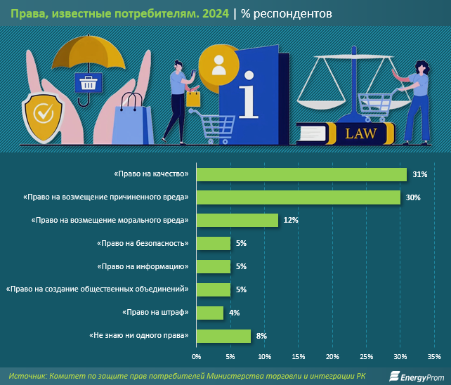 Что касается конкретных прав, о которых знают граждане: 31% респондентов известно о праве на качество, 30% — о праве на возмещение причинённого вреда. Ещё 12% отметили осведомлённость о праве на возмещение морального вреда, по 5% — о праве на безопасность, на получение информации и на создание общественных объединений. Помимо этого, 4% респондентов знают о праве на взыскание штрафа.