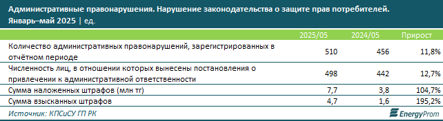 Что говорит по этому поводу профильная статистика? По данным КПСиСУ ГП РК, по итогам января–мая текущего года было зарегистрировано 510 административных правонарушений в сфере защиты прав потребителей — на 11,8% больше, чем годом ранее.