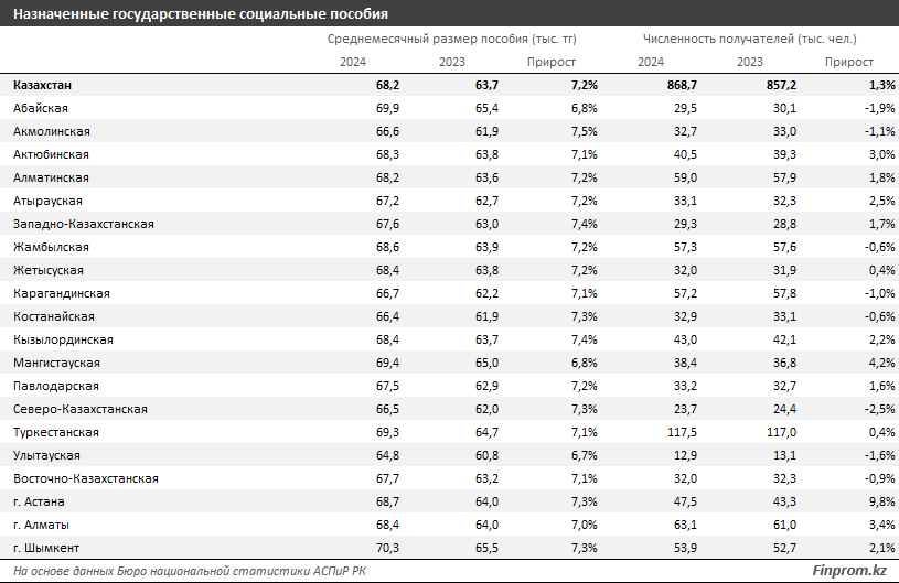За тот же период государственные социальные пособия получили 868,7 тыс. человек — на 1,3% больше, чем годом ранее. Среднемесячный размер пособия составил 68,2 тыс. тг — на 7,2% больше, чем в 2023-м.