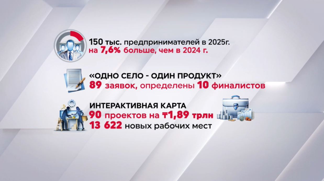 На интерактивной инвестиционной карте реализуется 90 проектов почти на два трлн тенге. Это свыше 13 тысяч новых рабочих мест. Из бюджета на развитие бизнеса выделено больше 6 млрд тенге. Средства направлены на субсидирование кредитов, гарантии по займам и лизингу, а также гранты для молодёжи и социального предпринимательства.