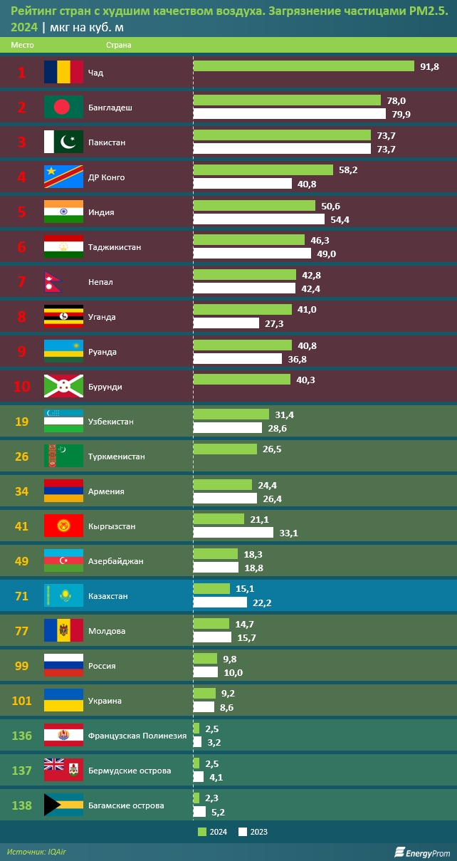 Среди стран с худшим по качеству воздухом, максимально загрязнённым частицами PM2.5, Казахстан по итогам 2024 года занял 71-е место из 138. Среднегодовая концентрация PM2.5 в РК, по данным IQAir, составила 15,1 мкг на куб. м, против 22,2 мкг на куб. м годом ранее. То есть показатель улучшился за год, однако остался весьма неблагоприятным. Концентрация частиц PM2.5 в воздухе, которым приходится дышать казахстанцам, в 3–5 раз выше, чем рекомендует Всемирная организация здравоохранения, передает «24KZ» со ссылкой на energyprom.kz.
