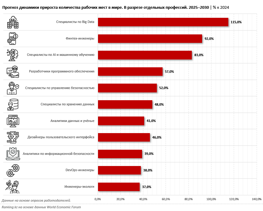 Такие серьёзные изменения связывают с тем, что автоматизация и цифровизация модифицируют почти 39% текущих навыков работников. В отчёте WEF приведены списки как уходящих в прошлое, так и наиболее динамично растущих профессий. К последним относится сфера IT. В число самых быстрорастущих профессий, согласно прогнозу WEF, вошли специалисты по Big Data (англ. — большие данные). По итогам опросов более 1 тыс. работодателей по всему миру, численность таких IT-экспертов вырастет более чем вдвое. Почти на 92% к 2030 году увеличится спрос на финтех-инженеров, на 83% — на специалистов по ИИ и машинному обучению. Разработчиков программного обеспечения понадобится уже на 57% больше, а спрос на data-аналитиков вырастет на 41%.