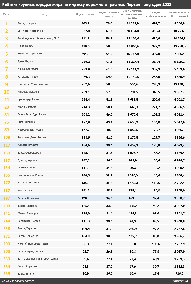 Алматы досталось 117-е место в рейтинге, что хуже, чем у столицы, а индекс дорожного трафика в этом мегаполисе РК составил 154,6 (индекс времени — 39,4 минуты, индекс экспоненциального разрыва времени — 1452,3, индекс неэффективности — 170,8, индекс выбросов CO₂ — 4093,4 грамма).