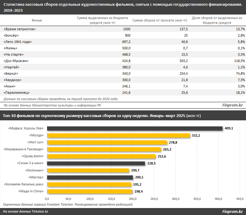 Контраргументы Министерства культуры и информации РК таковы: «Представители сферы зачастую не заинтересованы в производстве качественного продукта и его продвижении. Режиссёры стараются снимать картины для участия в фестивалях, ставят в приоритет свои личные творческие амбиции, забывая о запросах широкой зрительской аудитории». Именно этими доводами представители ведомства объясняют отсутствие успеха у многих картин, снятых за счёт бюджетных средств. За период с 2019 по 2023 год Центром поддержки национального кино профинансированы 103 проекта на общую сумму в 19 млрд тг. Из них в 2023 году в кинопрокат вышли только 23 фильма, которые на тот момент суммарно заработали в прокате 1,5 млрд тг. В таблице ниже мы привели несколько примеров художественных фильмов, снятых, в числе прочего, благодаря государственному финансированию. Прокатные сборы у большинства этих фильмов настолько скромные, что едва достигают 10% от начального финансирования. Исключением можно назвать только аутентичную национальную картину «Дос-Мукасан» о легендарном одноимённом ансамбле, собравшую в прокате 503,2 млн тг при объёме государственного финансирования в 424,8 млн тг.