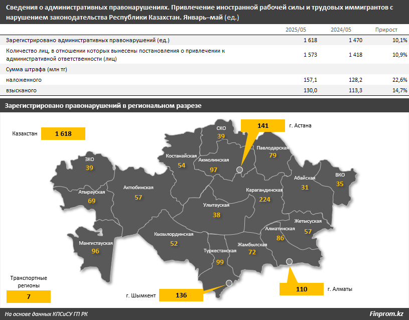 По итогам января–мая текущего года в стране зарегистрировано 1,6 тыс. административных правонарушений, связанных с привлечением иностранной рабочей силы и трудовых мигрантов с нарушением законодательства — на 10,1% больше, чем за аналогичный период прошлого года.