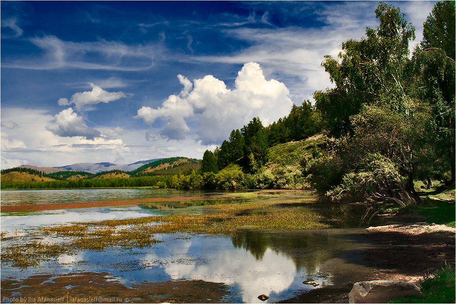 Озеро в Восточном Казахстане. Вода в нем очень прозрачная, а его живописные берега изрезаны заливами.