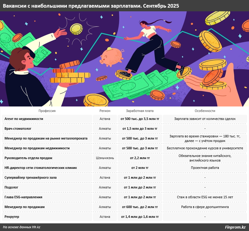 Судя по открытым данным рекрутинговых площадок, рынок труда сегодня не предлагает вышеуказанных высоких зарплат. Не исключено, что специалистов, чья работа оценивается в такие суммы, просто не «хантят» в интернете, а «перекупают» в других компаниях или взращивают внутри из перспективных сотрудников. Согласно анализу предложений на портале Hh.kz, потолок заработных плат в вакансиях — 3–3,5 млн тг. Заметим: это не фиксированная зарплата, а потенциальный заработок, который может получить работник, если заключит определённое количество контрактов, выполнит план продаж и т. д.
