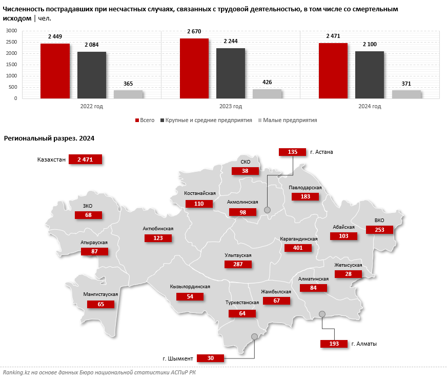 Меньше всего пострадавших на производстве насчитывалось в Жетысуской области (28 человек), Шымкенте (30 человек) и Северо-Казахстанской области (38 человек).