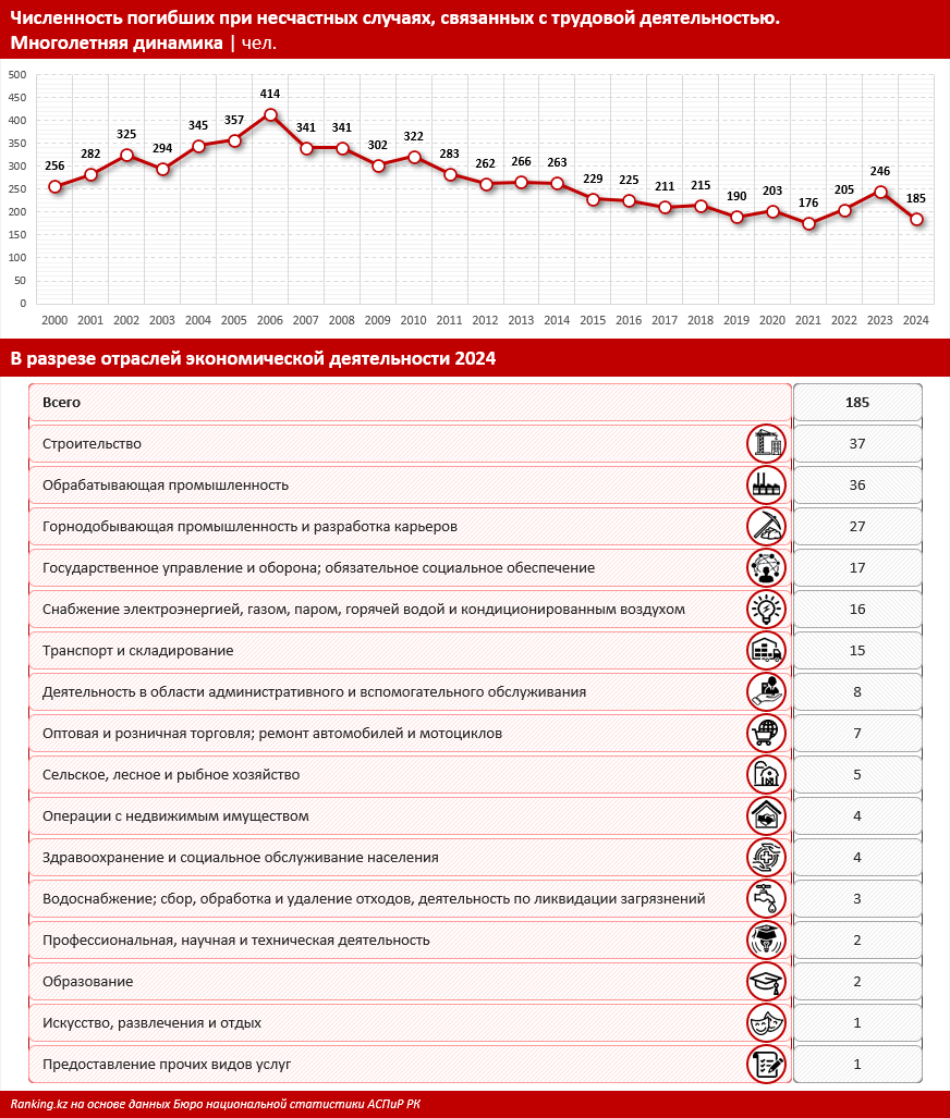 Среди отраслей с наибольшей численностью погибших при несчастных случаях, связанных с трудовой деятельностью, также оказались сфера государственного управления и обороны (17 человек) и коммунальный сектор (16 человек).