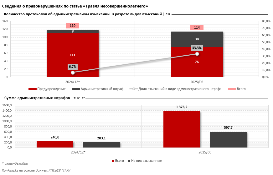 Суммы штрафов за травлю детей пока скромные. В прошлом году насчитывалось всего 8 административных правонарушений в секторе, по итогу которых на виновных были наложены штрафы. Общая сумма этих штрафов составила 240 тыс. тг, то есть в среднем по 30 тыс. тг с каждого нарушителя. В первом полугодии 2025-го общая сумма наложенных штрафов достигла 1,4 млн тг. Правда, взыскано пока меньше половины.