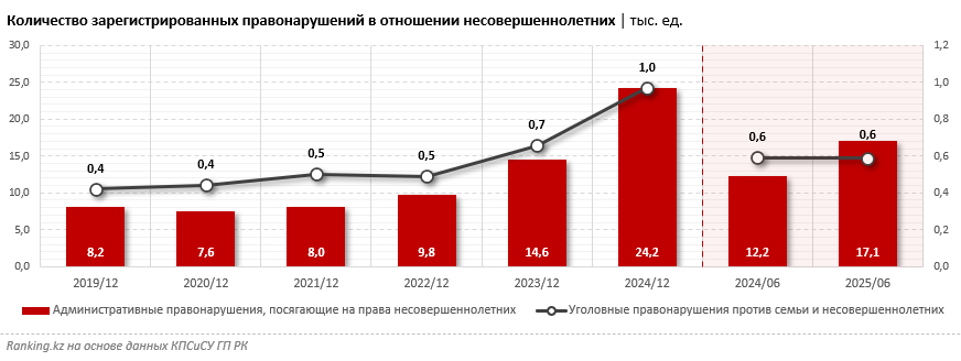 Статистика по уголовным делам пока не позволяет сделать вывод, что насилия в отношении несовершеннолетних становится меньше. По данным КПСиСУ ГП РК, в первом полугодии 2025-го было зарегистрировано около 600 уголовных правонарушений, жертвами которых стали дети. В прошлом году насчитывалось 971 уголовное правонарушение в отношении несовершеннолетних — на 47,6% больше, чем в 2023-м. В целом нерадостные показатели в этой категории растут два года подряд.