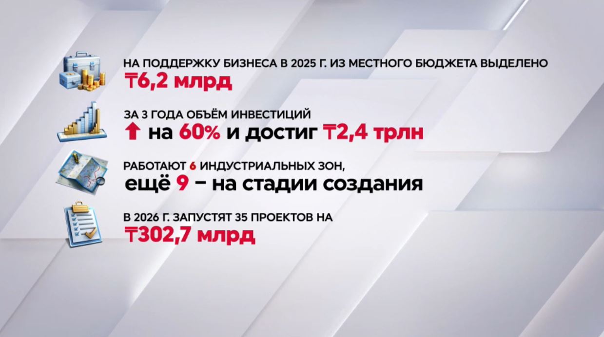 За три года объём инвестиций в экономику региона вырос на 60% и достиг почти 2,5 трлн тенге. В области работают шесть индустриальных зон, ещё 9 – на стадии формирования. В числе новых проектов – заводы, фабрики, логистический хаб и рыболовное хозяйство.