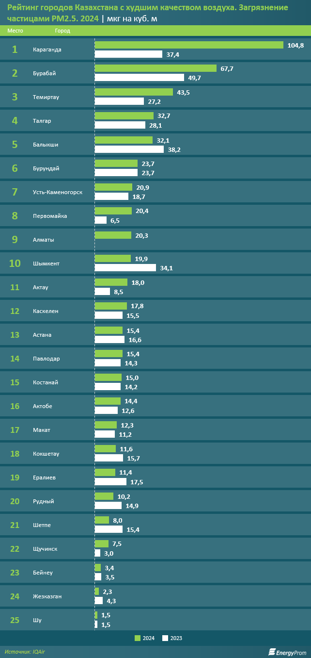 Что касается казахстанских городов, согласно отчёту 2024 года, самый небезопасный воздух был зарегистрирован в Караганде, где концентрация PM2.5 составила 104,8 мкг на куб. м. В мировом антирейтинге Караганда заняла третье место в мире после двух индийских городов — Бирнихате и Дели.